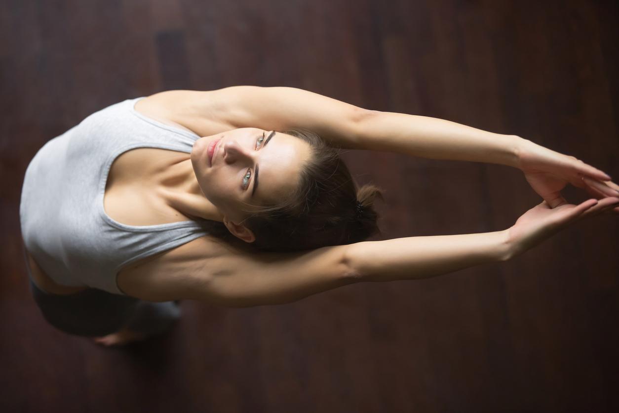 - Estira el brazo izquierdo de forma que quede perpendicular al torso y pegado a la colchoneta.