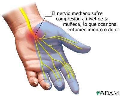 - Sensación de hormigueo y entumecimiento en el dedo pulgar y en los tres dedos siguientes.