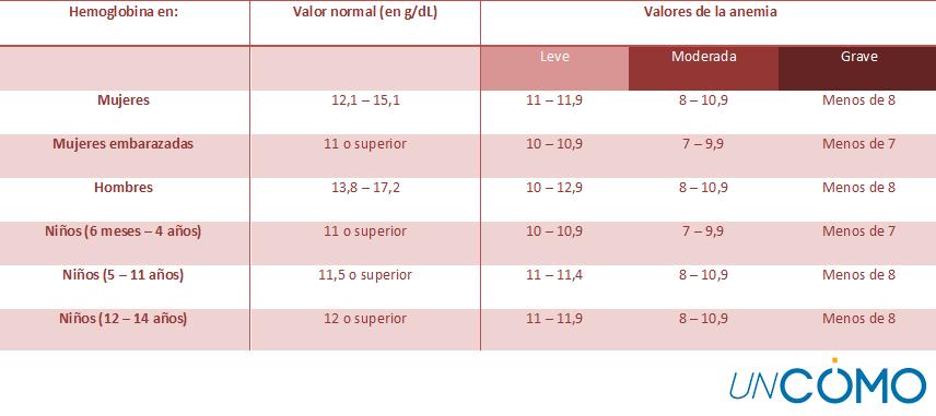 El valor normal de la hemoglobina depende muchas veces de la buena nutrición y el ejercicio regular, pero no son los únicos detonantes de los desniveles. Pueden existir deficiencias de hierro o enfermedades subyacentes que expliquen la irregularidad. Si sospechas que tus valores están por debajo o por encima de lo normal, aquí puedes mirar el estándar que utilizan en la mayoría de las pruebas. Sin embargo, ten en cuenta que estos números pueden variar ligeramente dependiendo del laboratorio.