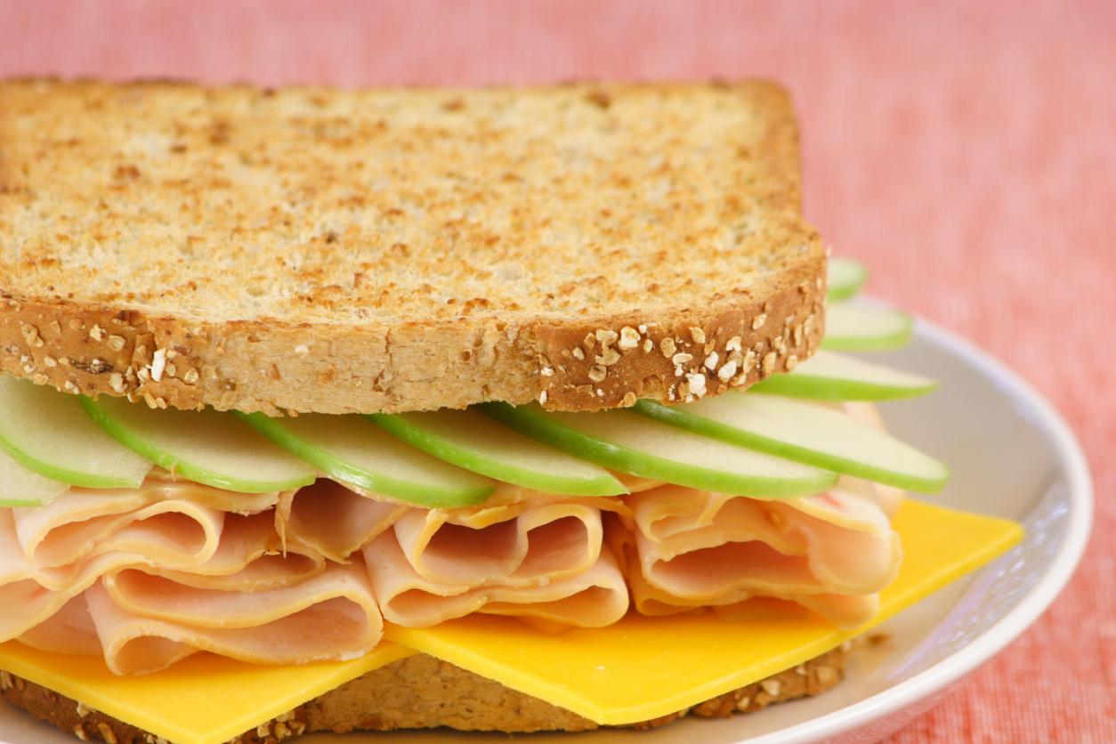 Sándwich de pan integral con pavo, manzana y queso