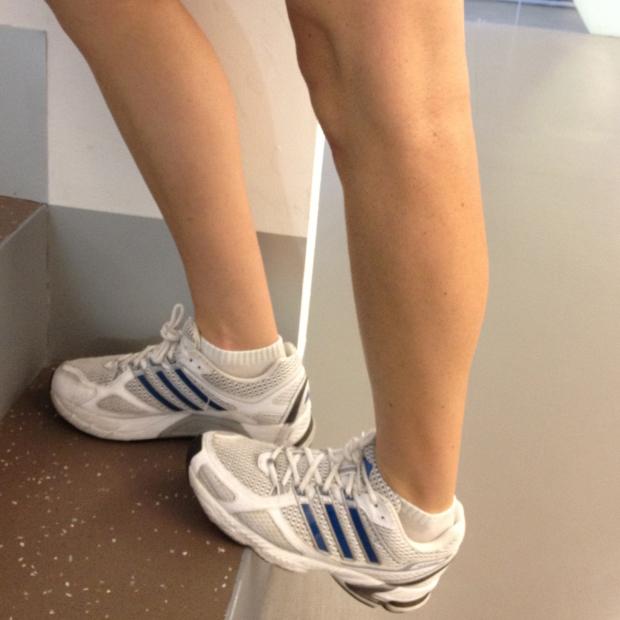 Si en casa no tienes ningún escalón sobre el que realizar el ejercicio, puedes utilizar una tabla inclinada u objeto que haga de escalón. Coloca los dos pies en el escalón, el sano completamente plano sobre él y el dañado en el extremo. Luego, lentamente y con mucho cuidado, baja el talón del pie con fascitis hacia el suelo de manera que te quede el pie inclinado, con los dedos apoyados en el escalón y el talón hacia el suelo. Así, la pierna del pie afectado debe estar estirada, mientras que la rodilla del sano ligeramente inclinada. Mantén esta posición durante 30 segundos para ejercer tensión sobre la fascia dañada. Descansa y repite el estiramiento cuatro veces más. Deberás hacer una serie al día de cinco repeticiones.