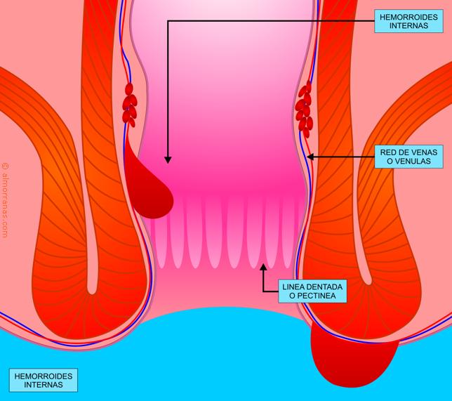 Estas hemorroides derivan del plexo hemorroidal interno, situado por encima de la línea dentada, están recubiertas de mucosa rectal (con un bajo número de fibras nerviosas sensitivas). Drenan al sistema Porta. Se subclasifican en 4 grados, dependiendo del grado de prolapso: