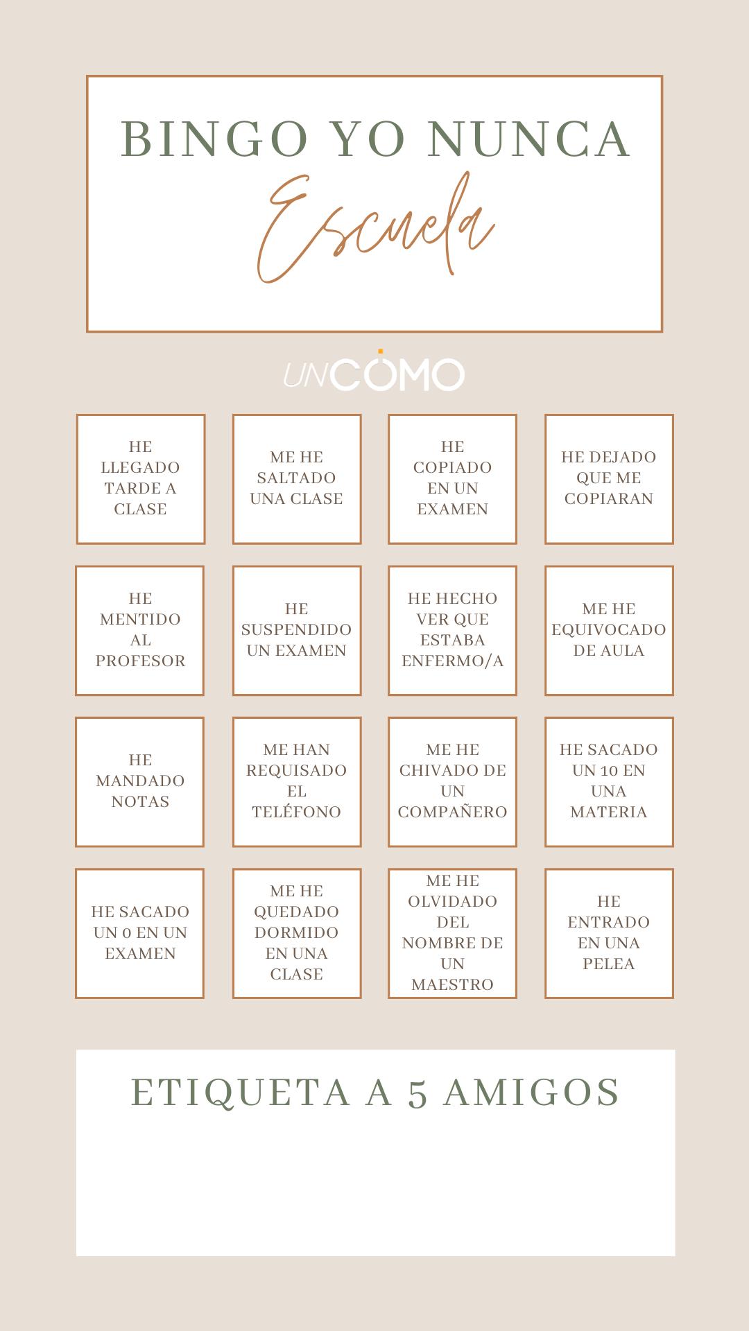 Con un bingo de yo nunca nunca puedes divertirte muchísimo con tus amigos, incluyendo 10 situaciones o actividades que, tal vez, no siempre sea agradable haber realizado o vivido. Lo mejor de esta cadena es que puedes adecuarla a cualquier contexto de la vida cotidiana (la escuela, el hogar, el trabajo). Cada amigo que etiquetes deberá marcar las opciones que desee.