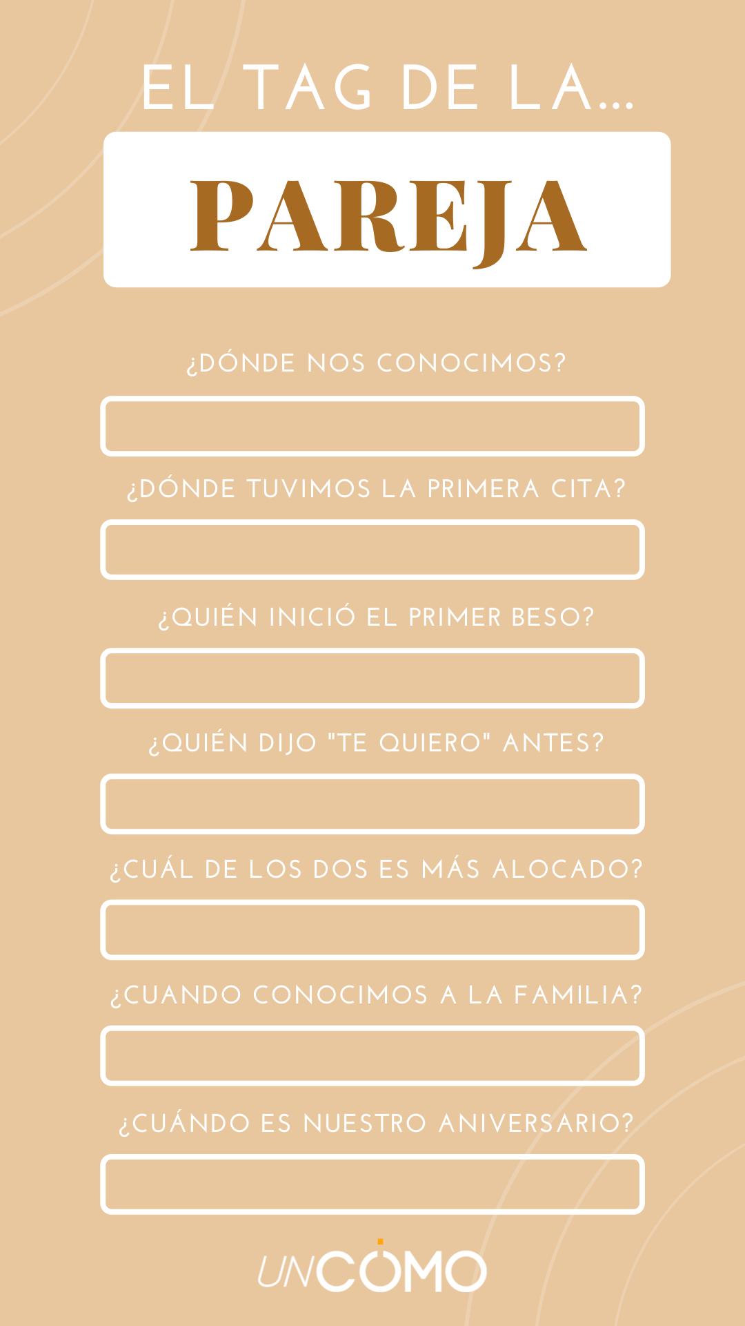 El tag de la pareja consiste en explicar un poco más sobre vuestra relación para los más curiosos... haz las preguntas que más te interesen y contesta honestamente antes de etiquetar a otras personas para que hablen también de sus novios o novias. ¡Por supuesto, también puedes etiquetar a tu pareja!