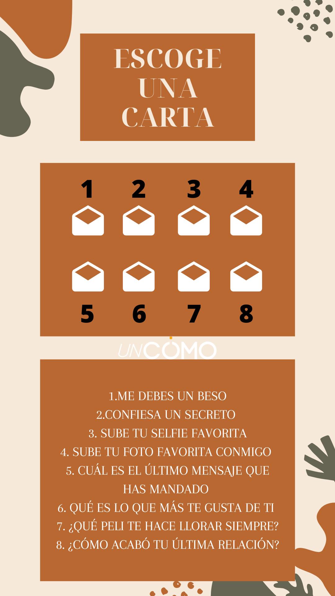 En esta cadena para Instagram deberás colocar dos imágenes. En una, coloca 8 emojis de sobres de carta, cada uno con un número. Luego, en la segunda imagen, coloca la lista con un reto correspondiente a cada carta. Puedes colocar retos y misiones, como "me debes un beso", "tendrás que confesarme un secreto" o "sube una foto conmigo a tus estados". ¡Puedes orientar la cadena a cualquier ámbito, público o personal!
