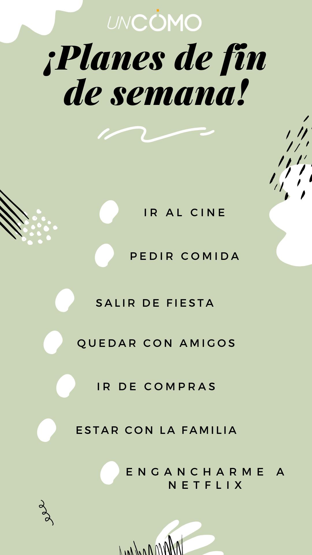 Si se acerca el fin de semana y quieres fardar de planes o conocer los de tus mejores amigos, esta plantilla te encantará. ¡Señala únicamente lo que tengas pensado hacer! Te damos algunas ideas, pero, por supuesto, puedes completar la lista con los planes que tú prefieras.