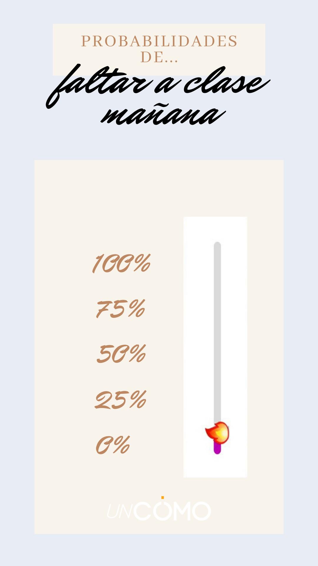 La cadena de probabilidad consiste en colocar una escala para responder una situación determinada. Por ejemplo, ¿qué probabilidad hay de faltar a clases mañana? Solo debes colocar cinco porcentajes (100%; 75%; 50%; 25% y 0%) y esperar a que cada amigo te responda. ¡Sírvete del sticker de Instagram para votar!