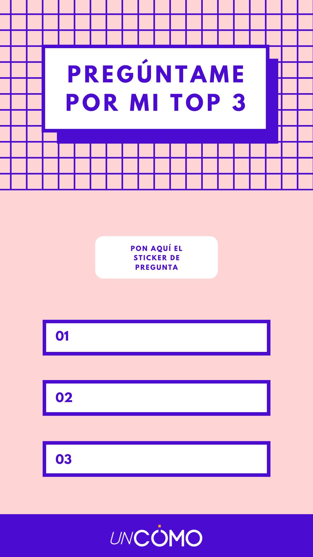 Se trata de una de las cadenas para Instagram más sencillas y divertidas que existen; deja que la gente te pregunte por tu Top 3 de alguna cosa y contesta honestamente con un diseño original como el que te mostramos a continuación.