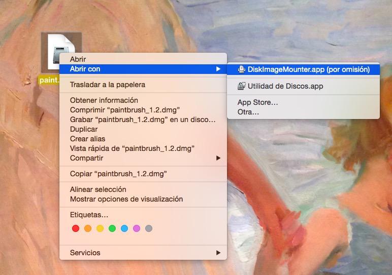 Para abrir archivos dmg en Mac, simplemente sitúate con el ratón sobre el documento y presiona botón derecho. El sistema te recomendará dos alternativas para la apertura: