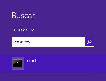 Una de las formas más sencillas para abrir una ventana de comandos en Windows 8 es dirigirte al Inicio de tu PC y escribir en el buscador o directamente en la pantalla: cmd.exe