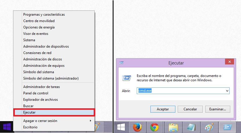 Así mismo, también puedes abrir los comandos presionando con el botón derecho del ratón sobre el botón de Inicio de tu PC y seleccionando "Ejecutar". En el momento en que se te abra una ventana emergente, deberás escribir en el cuadro de texto: cmd.exe y presionar la tecla intro de tu teclado, o el botón Aceptar.