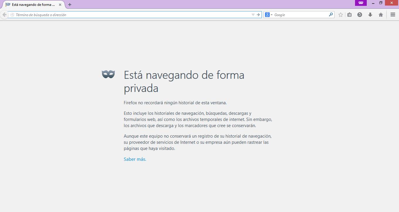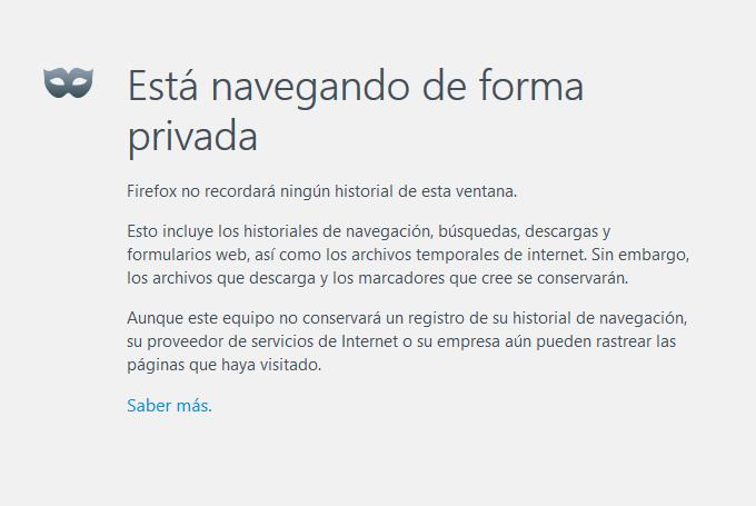 Una vez que se te abra la ventana privada de Firefox, te aparecerá un mensaje sobreimpreso pero, de todos modos, mientras navegues de incógnito se mantendrá en la barra superior un icono en forma de antifaz. De este modo, podrás corroborar que tu navegador sigue en modo de navegación privada y, por lo tanto, no se está guardando tu historial ni contraseñas, así como se eliminarán tus cookies automáticamente, entre otros.