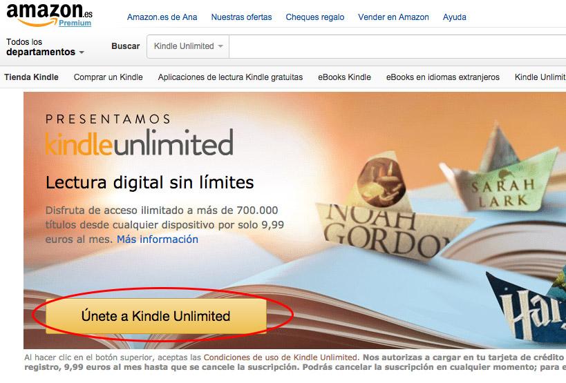 Una vez ahí, haz clic en el botón grande en el que dice 'Únete a Kindle Unlimited'.