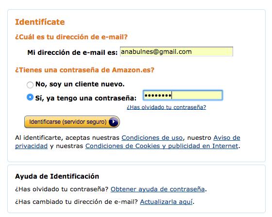 Introduce los datos de tu cuenta de Amazon.es y haz clic en el botón 'Identificarse (en servidor seguro)'.