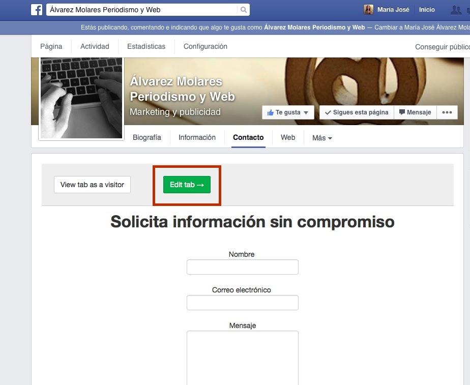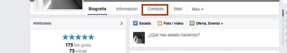 Aquí vemos el resultado, con la pestaña de “Contacto” más visible en la página de Facebook, de modo que tus clientes pueden acceder fácilmente a tus datos de contacto.