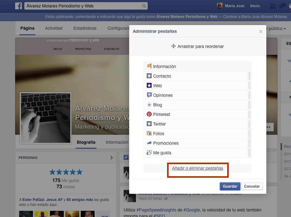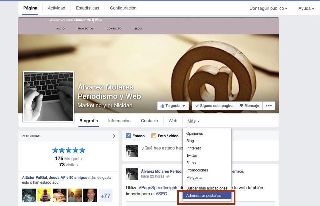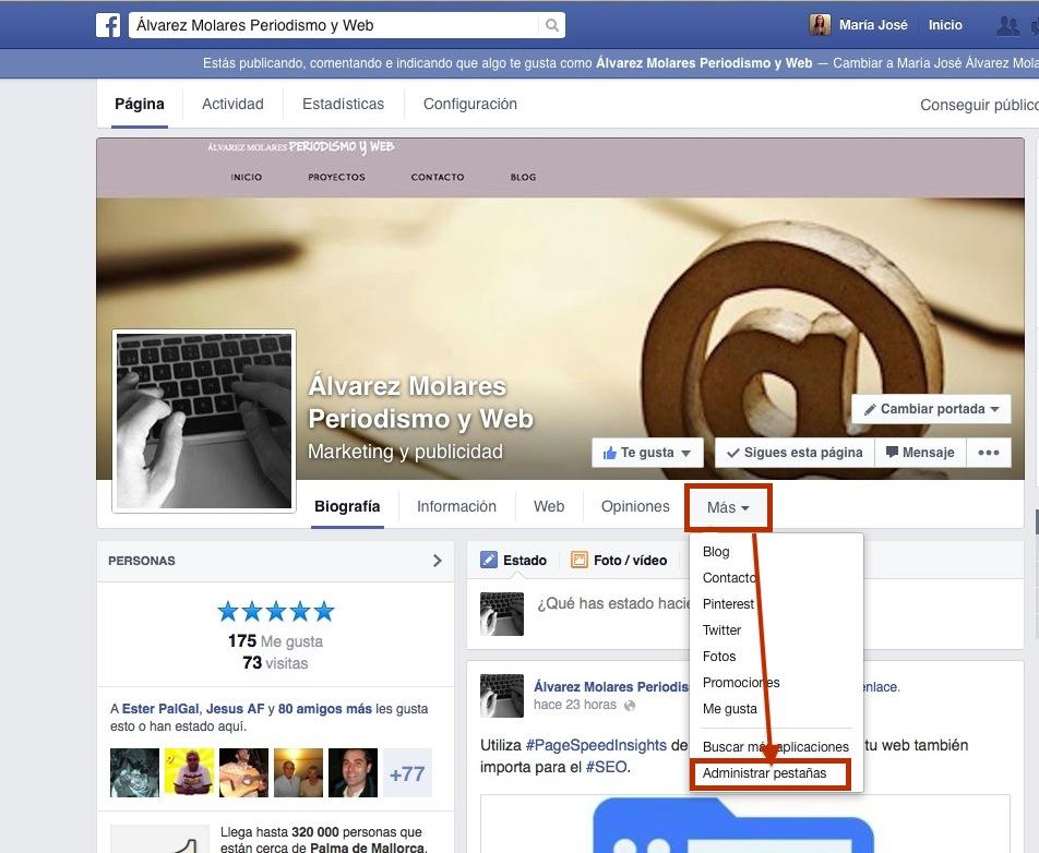 En este primer paso vamos a explicar cómo cambiar el orden de las pestañas bajo la foto de portada. La de “Biografía” e “Información” no se pueden mover, así que tendremos que trabajar con el resto. En nuestro ejemplo tenemos “Web” y “Opiniones” y, si pulsamos en “Más”, tendremos acceso al resto de las pestañas, “Blog”, “Contacto”, etc; y al botón de “Administrar pestañas”, que es dónde debemos pulsar.