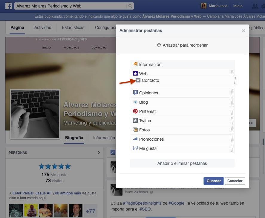 En esta imagen puedes ver cómo administramos las pestañas de la página de Facebook moviendo la pestaña de “Contacto” hacia arriba, de modo que quede de primera y se vea bajo la foto de portada sin necesidad de pulsar en “Más”. Tras ponerla en el sitio deseado, pulsamos en “Guardar”.