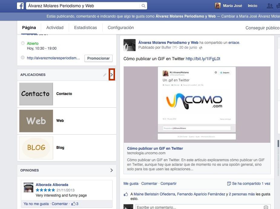 Como dijimos anteriormente, las pestañas de la página de Facebook también aparecen en la columna derecha, como ves en la imagen. Sin embargo, no están tan visibles como en el anterior diseño de Facebook, ya que es necesario hacer scroll para verlas. Pulsando sobre el botón que remarcamos tendrás acceso a un listado de todas tus pestañas.