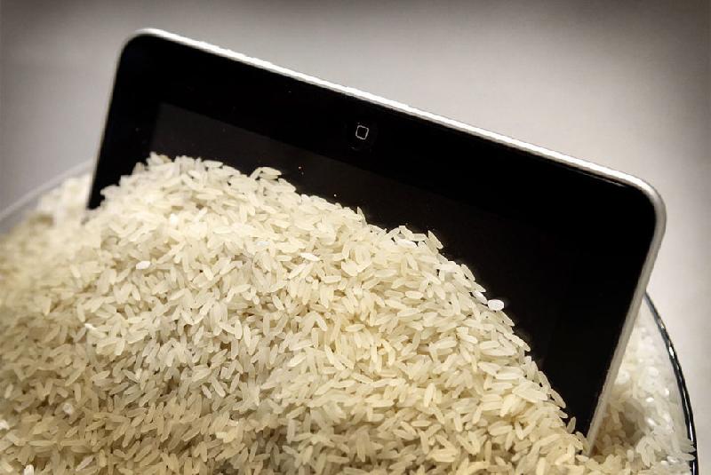 Con el agua eliminada, toca deshacerse de la humedad, que amenaza con ser quien mate a tu dispositivo definitivamente. Para esto, cogemos un cuenco u otro recipiente amplio y lo llenamos de arroz (es muy absorbente). Hundimos las piezas del dispositivo entre los granos y las dejamos un mínimo de 24 horas.