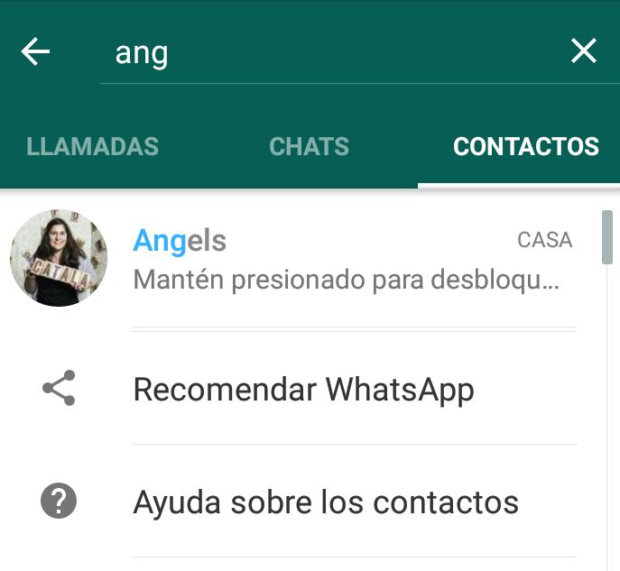 Para bloquear a un contacto de Whatsapp en Android deberás entrar en la aplicación y dirigirte a la pestaña de de Contactos, allí presiona el icono de la lupa y escribe el nombre de la persona a la que deseas bloquear. Una vez que aparezca clica sobre el contacto como si fueras a escribirle.