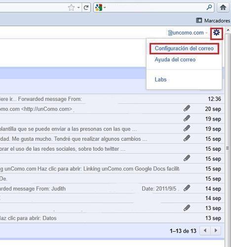 Una vez dentro, acude hacia la derecha de la pantalla y haz click en el icono de la tuerca que aparece; seguidamente, selecciona 'Configuración del correo'.