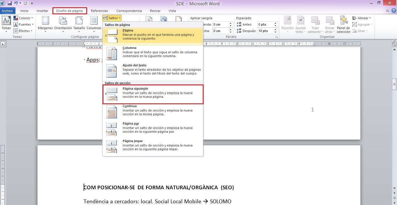 Es entonces cuando debemos recurrir a las secciones para poder crear una paginación discontinua en Word. Para ello, deberás colocar el cursor en la página a la que quieres cambiarle el número de página y seleccionar la pestaña 'Diseño de la página'; seguidamente, presiona sobre la opción Saltos/Saltos de sección/Página siguiente.