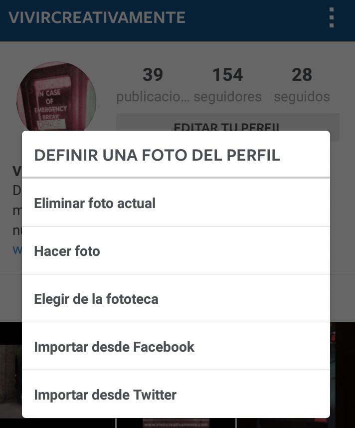Al clicar en el círculo de la imagen se abrirá un recuadro como el que vez en esta foto, elige el lugar de origen de la imagen que quieres para tu perfil y súbela a Instagram. Así de fácil y sin complicaciones, podrás hacer una foto en ese mismo momento y subirla, elegirla de tu cámara, importarla desde Facebook o desde Twitter. Las opciones sobran para elegir la imagen que prefieras y personalizar tu perfil de Instagram a tu gusto.
