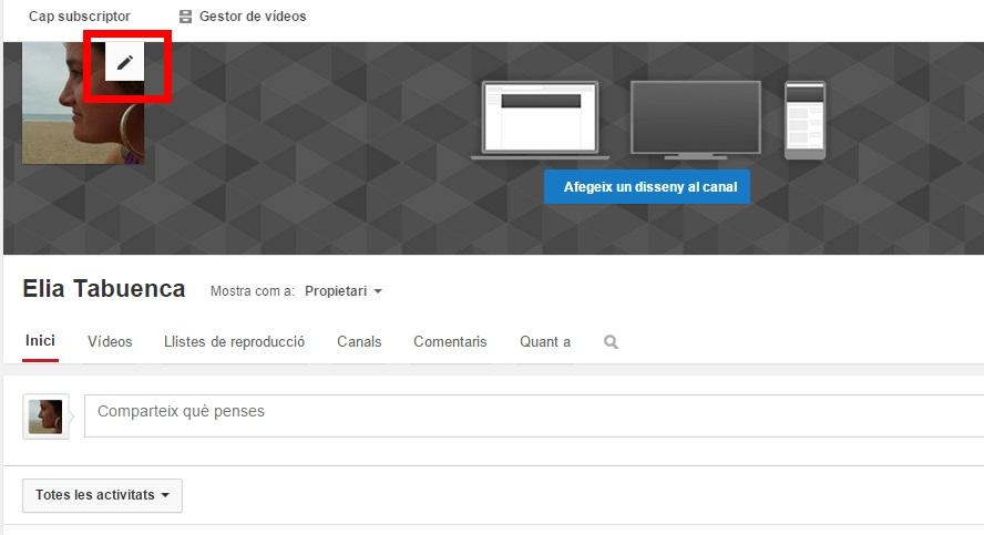 Ahora te aparecerá tu canal de Youtube así que para cambiar la foto tan solo tendrás que poner el cursor sobre la que tienes actualmente y verás cómo aparece un botón con un lápiz para editarla. Pincha encima de este símbolo.