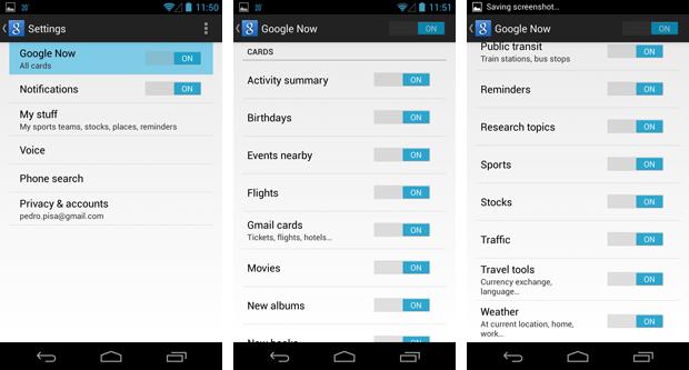 Toca decidir qué tarjetas quieres ver. Vuelve a "Settings" y, una vez ahí, vete a "Google Now All Cards". Aparecerá un listado con todas las tarjetas que tiene Google Now disponibles. Activa las que te interese ver.