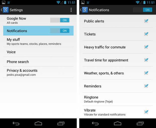 Puedes también configurar cuándo y por qué quieres que Google Now te envíe notificaciones. En Settings>Notifications, selecciona todas las razones por las que te gustaría recibir un aviso. Tráfico especialmente denso, la hora a la que deberías salir teniendo en cuenta los eventos de tu agenda, recordatorios, etc.