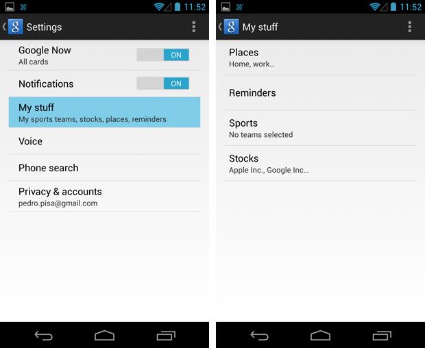 De nuevo en Settings, hay otra opción que se llama "My Stuff", muy práctica para decirle a Google Now cosas que te interesan especialmente. Puedes introducir las direcciones de tu casa, trabajo y otros lugares a los que suelas ir, configurar los recordatorios, seleccionar deportes y equipos sobre los que quieres estar informado e incluso las empresas que sigues en bolsa.