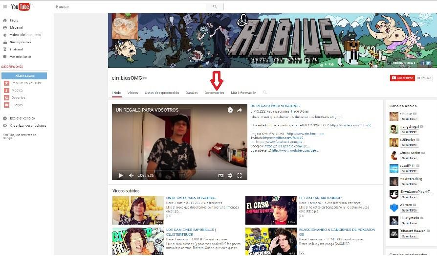 La primera forma de contactar con ElRubius es dirigiendote a su canal ElRubiusOMG en la plataforma Youtube y, una vez allí, ir a la sección de comentarios. Podrás acceder clicando en la casilla que te hemos marcado en la fotografía de abajo. Una allí escribe lo que quieras y, con suerte, ElRubius te responderá.