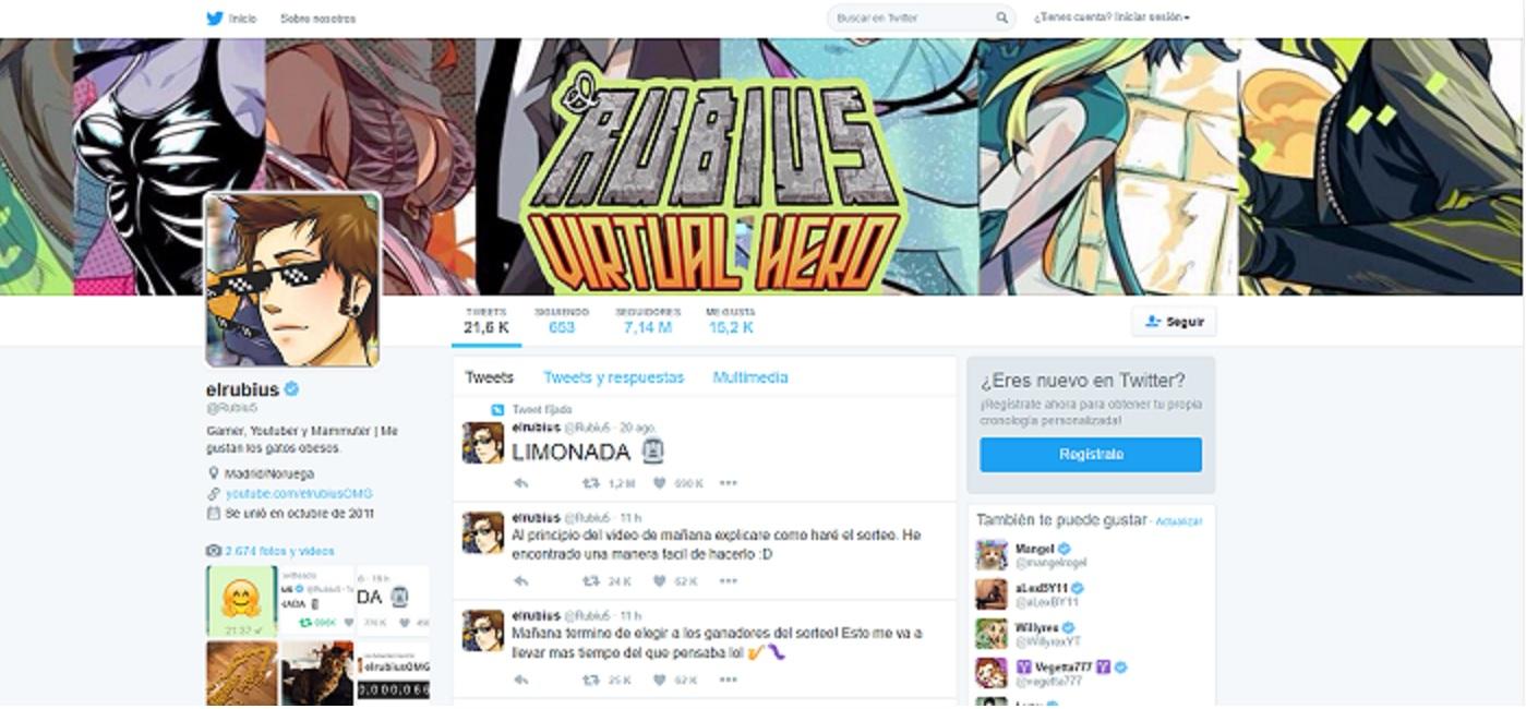 Si quieres saber cómo contactar con ElRubius quizás te interesa saber que Twitter es otra de las redes en las que el youtuber está muy activo, aunque a diferencia de los más de 20 millones que le siguen el Youtube, aquí la cifra baja hasta los 6,6.