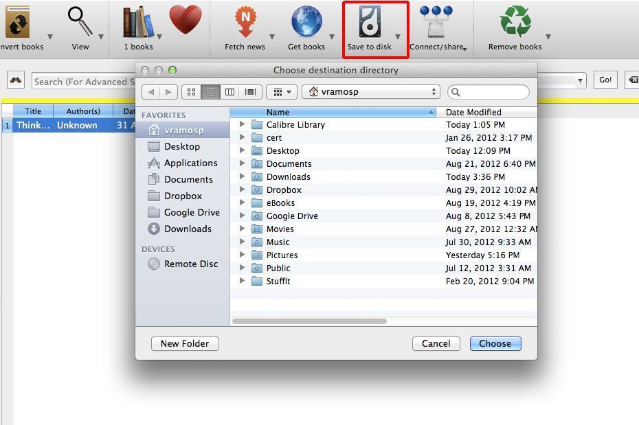 Comprueba que el archivo que has añadido aparece en tu librería. Si no haces ningún cambio, el archivo resultante se guardará en la misma carpeta que el original. Si quieres cambiar la carpeta de destino, pincha en el icono de "Save to disk" y elige la carpeta donde quieres guardar el archivo MOBI.