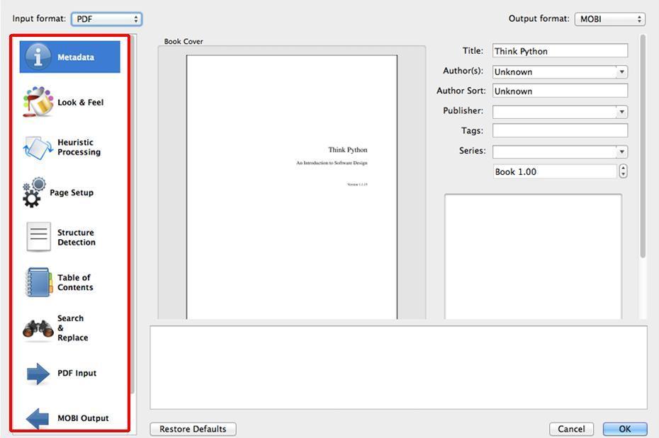 Hasta aquí hemos realizado una configuración sencilla para convertir el PDF a MOBI. Con esto es suficiente, pero si quieres modificar otras características del archivo resultante, como por ejemplo el tamaño de letra, el interlineado, la estructura, el índice, corrección de errores o determinadas, palabras, deberás utilizar las opciones del menú de la izquierda.Cuando hayas terminado, dale al botón de "Ok" para empezar el proceso de conversión.