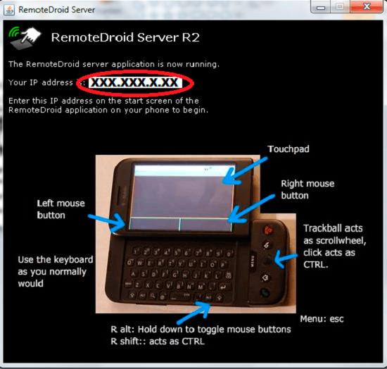 En el ordenador, extrae el archivo zip que te has descargado haciendo doble click sobre él. A continuación, ve a la carpeta que se ha creado y busca el archivo RemoteDroidServer.jar. Haz doble click sobre él para que así se inicie la aplicación de servidor. Se abrirá una ventana que nos mostrará una serie de datos: apunta la dirección IP