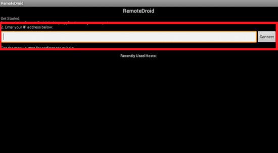 Vuelve a tu dispositivo Android y busca la app RemoteDroid en la lista de aplicaciones. Ábrela pulsando sobre ella. Verás un espacio en blanco sobre el que pone "IP address below". Copia en él los números de la dirección IP que has copiado al lanzar la aplicación en el ordenador y pulsa en el botón "Connect". Espera unos segundos hasta que se establezca la conexión.