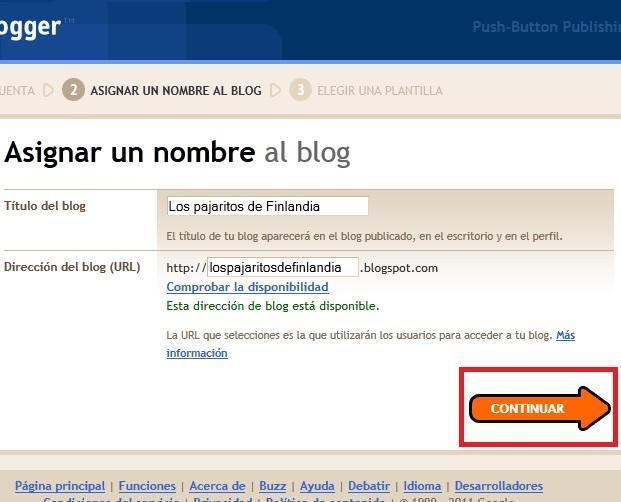 Asígnale un título al blog, así como una dirección. A continuación, haz click en 'Continuar'.