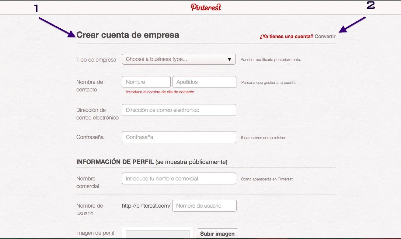 Lo primero que tenemos que hacer para crear un perfil de empresa en Pinterest es pinchar en este enlace. Aquí tendremos la opción (1) de hacer una cuenta desde cero o bien (2) aprovechar las imágenes que ya habíamos subido con un perfil normal.