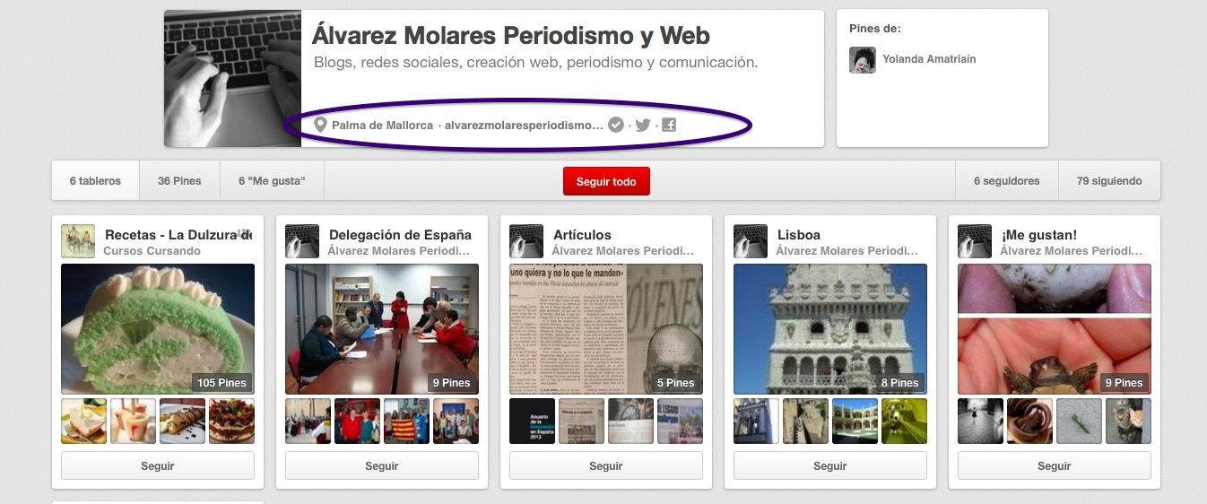 El resultado de que verifiquemos nuestra web, que se muestra con un 'visto', y enlacemos a otras redes sociales será muy visible en nuestro perfil de empresa en Pinterest y una forma más de generar un intercambio de visitantes entre nuestras redes sociales.