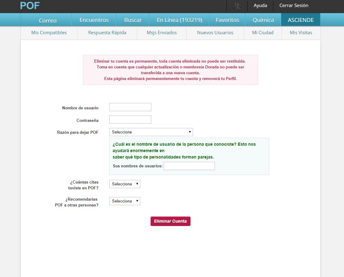 Así mismo, deberás ingresar el motivo por el que quieres dejar de formar parte de la comunidad de POF, cuántas citas tuviste y si recomendarías esta red social a otras personas. En el momento en que hagas clic sobre el botón "Eliminar cuenta", ya no habrá vuelta atrás.