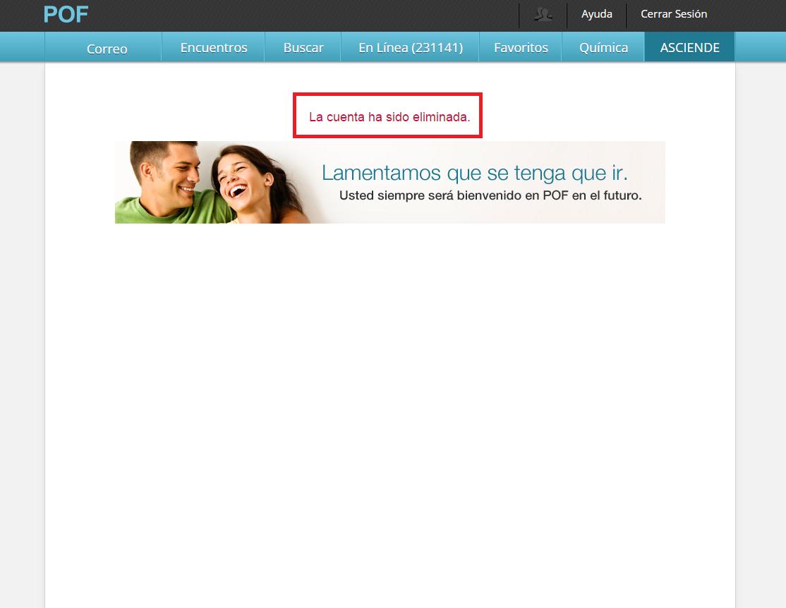 A continuación, aparecerá una pantalla que te confirmará que tu cuenta de POF ha sido definitivamente eliminada y, por lo tanto, ya has sido dado de baja de este servicio. En caso de que algún día quieras volver a abrir una cuenta, deberás repetir los pasos de registro.