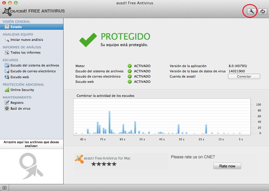 Abre Avast y haz click en el icono de una llave inglesa que aparece arriba a la derecha.