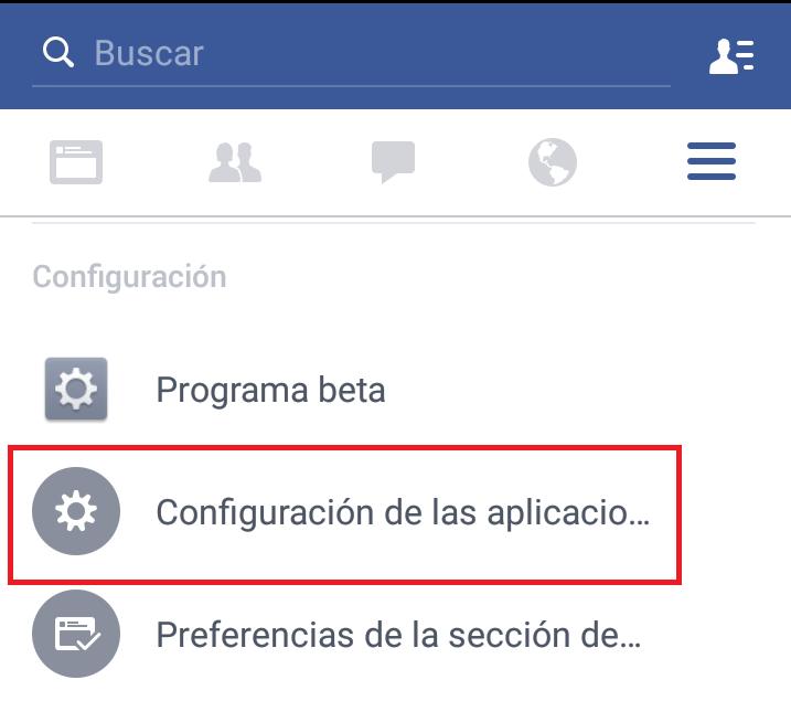 Una vez allí deberás bajar hasta el apartado de Configuración y luego presionar la alternativa de Configuración de las aplicaciones para acceder a las distintas alternativas de apps vinculadas a Facebook.