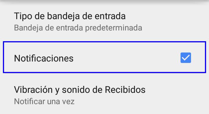 En este momento, ya verás la opción de 'Notificaciones' que por defecto aparecerá marcada; tan simple como desmarcarla para dejar de recibir avisos cada vez que tengas un nuevo e-mail en tu bandeja de entrada de Gmail. Si lo que quieres es cambiar cuándo vibra o suena, también podrás hacerlo a través de la siguiente opción de este menú.