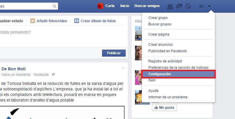 Para ello, lo primero que deberás hacer será iniciar tu sesión en Facebook con tu dirección de correo electrónico y contraseña. Una vez que estés en la página inicial, deberás hacer clic sobre la flecha que aparece en la parte derecha de la barra superior para abrir el menú desplegable y, a continuación, deberás presionar sobre la opción 'Configuración'.