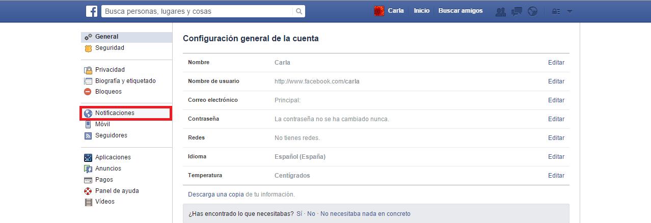 En este momento verás las opciones generales de tu cuenta de Facebook, sin embargo deberás dirigirte a la categoría 'Notificaciones' a través del menú del lateral izquierdo, para así poder desactivar los correos electrónicos que estás recibiendo.