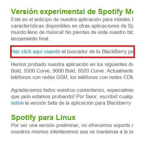 Dirígete a la sección 'Versión experimental de Spotify Mobile para BlackBerry' y selecciona 'Haz click aquí usando el buscador de tu BlackBerry para empezar el proceso de instalación'.