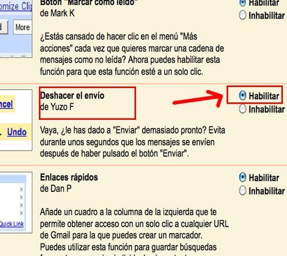Busca entre los servicios Labs habilitados la prestación 'Deshacer el envío' por Yuzo F. y, a continuación, selecciona la alternativa 'Habilitar'. De esta manera, ya tendríamos disponible la opción de deshacer el envío de un correo electrónico.