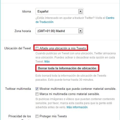 En la sección 'Ubicación del Tweet', elimina la opción 'Añade una ubicación a mis Tweets' y, seguidamente, selecciona 'Borrar toda la información de ubicación'.